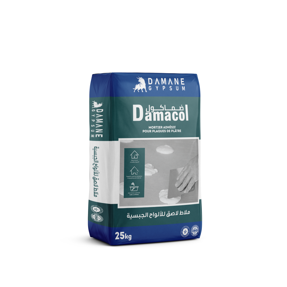 DAMACOL est un mortier adhésif fabriqué à base de plâtre, spécialement conçu pour la fixation des plaques de plâtre sur les murs intérieurs. Il se distingue par sa forte adhérence et sa facilité d’utilisation, garantissant une fixation solide et durable